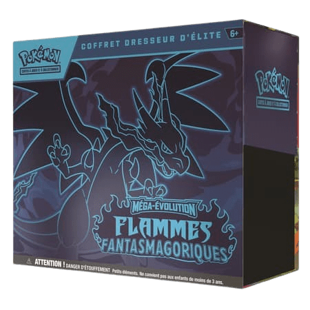 Le Coffret Dresseur d’élite Méga-Évolution – Flammes Fantasmagoriques du JCC Pokémon contient :